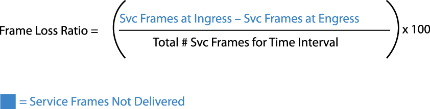 Frame-loss ratio is defined as a percentage of the number of service frames not delivered divided by the total number of service frames during a defined time interval, where the number of service frames not delivered is the difference between the number of service frames arriving at the ingress Ethernet flow point and the number of service frames delivered at the egress Ethernet flow point in a point-to-point Ethernet connection (see Frame-Loss Ratio Formula).