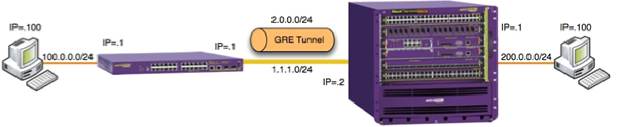 configure default del port all create vlan inet configure vlan inet add port 24 configure vlan inet ipa 1.1.1.1/24 create vlan users configure vlan users add port 1 configure vlan users ipa 100.0.0.1/24 create tunnel mytunnel gre destination 1.1.1.2 source 1.1.1.1 configure tunnel "mytunnel" ipaddress 2.0.0.1/24 configure iproute add 200.0.0.0/24 2.0.0.2 enable ipforwarding