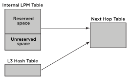 The Longest Prefix Match (LPM) and Layer 3 (L3) Hash tables store host and route information for fast-path forwarding. When the switch locates a route or host in one of these tables, it follows a table index to the Next Hop table, which contains MAC address and egress port information that is shared by the hosts and routes in the other tables. The hardware routing table capacity is partly determined by the capacity of the Next Hop table. The Next Hop table capacity is smaller than the combined capacity of the other tables because typically, multiple routes and hosts share each Next Hop table entry. When the other tables map to many different next hop entries, the Next Hop table can limit the total number of hosts and routes stored in hardware.