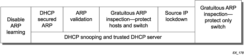 IP Security Dependencies displays the dependencies of IP security. Any feature that appears directly above another feature depends on it. For example, to configure ARP validation, you must configure DHCP snooping and trusted DHCP server.