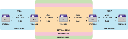 CE1: configure snmp sysName "CE1" create vlan "lo0" enable loopback-mode vlan lo0 create vlan "vl100" configure vlan vl100 tag 100 enable jumbo-frame ports 1 configure vlan vl100 add ports 1 tagged configure vlan Mgmt ipaddress 192.168.56.111 255.255.255.0 configure vlan lo0 ipaddress 172.16.0.1 255.255.255.255 configure vlan vl100 ipaddress 10.1.1.1 255.255.255.252 enable ipforwarding vlan vl100 configure bgp AS-number 65100 configure bgp routerid 172.16.0.1 create bgp neighbor 10.1.1.2 remote-AS-number 65000 enable bgp neighbor 10.1.1.2 enable bgp PE1: configure snmp sysName "PE1" create vr "vpn-a" type vpn-vrf vr "VR-Default" configure vr VR-Default delete ports 1 configure vr vpn-a add ports 1 create vlan vl100 vr vpn-a tag 100 configure vl100 add ports 1 tagged create vlan "vl101" configure vlan vl101 tag 101 enable jumbo-frame ports 1 enable jumbo-frame ports 2 configure vlan vl100 add ports 1 tagged configure vlan vl101 add ports 2 tagged configure vlan Mgmt ipaddress 192.168.56.102 255.255.255.0 configure vlan lo0 ipaddress 172.16.0.2 255.255.255.255 enable ipforwarding vlan lo0 configure vlan vl101 ipaddress 10.1.1.5 255.255.255.252 enable ipforwarding vlan vl101 configure vlan vl100 ipaddress 10.1.1.2 255.255.255.252 enable ipforwarding vlan vl100 configure vr vpn-a add protocol bgp configure vr vpn-a rd 172.16.0.2:100 configure vr vpn-a route-target both add 65000:100 enable iproute mpls-next-hop configure bgp AS-number 65000 configure bgp routerid 172.16.0.2 create bgp neighbor 172.16.0.4 remote-AS-number 65000 configure bgp neighbor 172.16.0.4 source-interface ipaddress 172.16.0.2 enable bgp neighbor 172.16.0.4 configure bgp neighbor 172.16.0.4 next-hop-self configure bgp neighbor 172.16.0.4 address-family vpnv4 next-hop-self enable bgp neighbor 172.16.0.4 capability vpnv4 enable bgp export vr vpn-a direct address-family vpnv4 enable bgp export vr vpn-a bgp address-family vpnv4 enable bgp virtual-router vpn-a configure bgp AS-number 65000 configure bgp routerid 172.16.0.2 create bgp neighbor 10.1.1.1 remote-AS-number 65100 enable bgp neighbor 10.1.1.1 disable bgp neighbor 10.1.1.1 capability ipv4-multicast enable bgp export remote-vpn address-family ipv4-unicast enable bgp virtual-router VR-Default configure mpls add vlan "lo0" enable mpls vlan "lo0" enable mpls ldp vlan "lo0" configure mpls add vlan "vl101" enable mpls vlan "vl101" enable mpls ldp vlan "vl101" configure mpls lsr-id 172.16.0.2 enable mpls protocol ldp enable mpls configure ospf routerid 172.16.0.2 enable ospf configure ospf add vlan lo0 area 0.0.0.0 passive configure ospf add vlan vl101 area 0.0.0.0 link-type point-to-point P1: configure snmp sysName "P1" configure vlan default delete ports 1-2 create vlan "lo0" enable loopback-mode vlan lo0 create vlan "vl101" configure vlan vl101 tag 101 create vlan "vl102" configure vlan vl102 tag 102 enable jumbo-frame ports 1 enable jumbo-frame ports 2 configure vlan vl101 add ports 1 tagged configure vlan vl102 add ports 2 tagged configure vlan Mgmt ipaddress 192.168.56.103 255.255.255.0 configure vlan lo0 ipaddress 172.16.0.3 255.255.255.255 enable ipforwarding vlan lo0 configure vlan vl101 ipaddress 10.1.1.6 255.255.255.252 enable ipforwarding vlan vl101 configure vlan vl102 ipaddress 10.1.1.9 255.255.255.252 enable ipforwarding vlan vl102 enable iproute mpls-next-hop configure mpls add vlan "lo0" enable mpls vlan "lo0" enable mpls ldp vlan "lo0" configure mpls add vlan "vl101" enable mpls vlan "vl101" enable mpls ldp vlan "vl101" configure mpls add vlan "vl102" enable mpls vlan "vl102" enable mpls ldp vlan "vl102" configure mpls lsr-id 172.16.0.3 enable mpls protocol ldp enable mpls configure ospf routerid 172.16.0.3 enable ospf configure ospf add vlan lo0 area 0.0.0.0 passive configure ospf add vlan vl101 area 0.0.0.0 link-type point-to-point configure ospf add vlan vl102 area 0.0.0.0 link-type point-to-point PE2: configure snmp sysName "PE2" configure vr vpn-a add ports 2 configure vr VR-Default delete ports 2 create vr "vpn-a" type vpn-vrf vr "VR-Default" configure vlan default delete ports 2 create vlan "lo0" enable loopback-mode vlan lo0 create vlan "vl102" configure vlan vl102 tag 102 create vlan "vl103" vr vpn-a configure vlan vl103 tag 103 enable jumbo-frame ports 1 enable jumbo-frame ports 2 configure vlan vl102 add ports 1 tagged configure vlan vl103 add ports 2 tagged configure vlan Mgmt ipaddress 192.168.56.104 255.255.255.0 configure vlan lo0 ipaddress 172.16.0.4 255.255.255.255 enable ipforwarding vlan lo0 configure vlan vl102 ipaddress 10.1.1.10 255.255.255.252 enable ipforwarding vlan vl102 configure vlan vl103 ipaddress 10.1.1.13 255.255.255.252 enable ipforwarding vlan vl103 configure vr vpn-a add protocol bgp configure vr vpn-a rd 172.16.0.4:103 configure vr vpn-a route-target both add 65000:100 enable iproute mpls-next-hop configure bgp AS-number 65000 configure bgp routerid 172.16.0.4 create bgp neighbor 172.16.0.2 remote-AS-number 65000 configure bgp neighbor 172.16.0.2 source-interface ipaddress 172.16.0.4 enable bgp neighbor 172.16.0.2 configure bgp neighbor 172.16.0.2 next-hop-self configure bgp neighbor 172.16.0.2 address-family vpnv4 next-hop-self enable bgp neighbor 172.16.0.2 capability vpnv4 enable bgp export vr vpn-a direct address-family vpnv4 enable bgp export vr vpn-a bgp address-family vpnv4 enable bgp virtual-router vpn-a configure bgp AS-number 65000 configure bgp routerid 172.16.0.4 create bgp neighbor 10.1.1.14 remote-AS-number 65101 enable bgp neighbor 10.1.1.14 disable bgp neighbor 10.1.1.14 capability ipv4-multicast enable bgp export remote-vpn address-family ipv4-unicast enable bgp virtual-router VR-Default configure mpls add vlan "lo0" enable mpls vlan "lo0" enable mpls ldp vlan "lo0" configure mpls add vlan "vl102" enable mpls vlan "vl102" enable mpls ldp vlan "vl102" configure mpls lsr-id 172.16.0.4 enable mpls protocol ldp enable mpls configure ospf routerid 172.16.0.4 enable ospf configure ospf add vlan lo0 area 0.0.0.