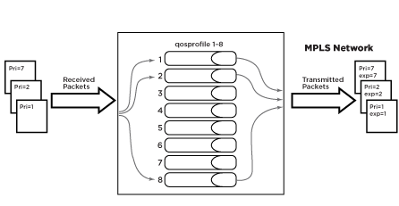 The priority of Ethernet tagged packets can be mapped into the MPLS network and vice versa using the switch fabric qosprofile.
