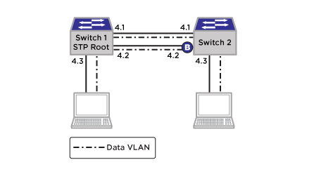 Actual implementation steps on a production network may differ based on the physical topology, switch models, and software versions deployed.The sample STP network is a simple two-switch topology connected with two Gigabit Ethernet trunk links, which form a broadcast loop. Both Extreme Networks switches are configured for 802.1D mode STP running on a single data VLAN named Data. The sample STP network for migration to EAPS is shown in Sample STP Network for Migration to EAPS.