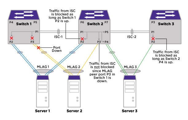 In the case of an MLAG port failure, the blocking rule on the peer MLAG switch will be removed and the traffic coming on the ISC will be forwarded to the corresponding MLAG port.