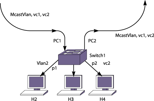 In the same way as the IGMP snooping forwarding rules, the multicast stream is forwarded onto member ports and router ports on the VLAN. For a stream received on MVR enabled ports, this rule is extended to extend membership and router ports to all other VLANs. This rule works well on the topology in Multiple VLANs in the Core Network. However, in a tagged core topology, this rule forwards traffic onto VLANs, such as vc1 and vc2, on ports PC1 and PC2. This results in multiple copies of same stream on the core network, thus reintroducing the problem that MVR was intended to solve.