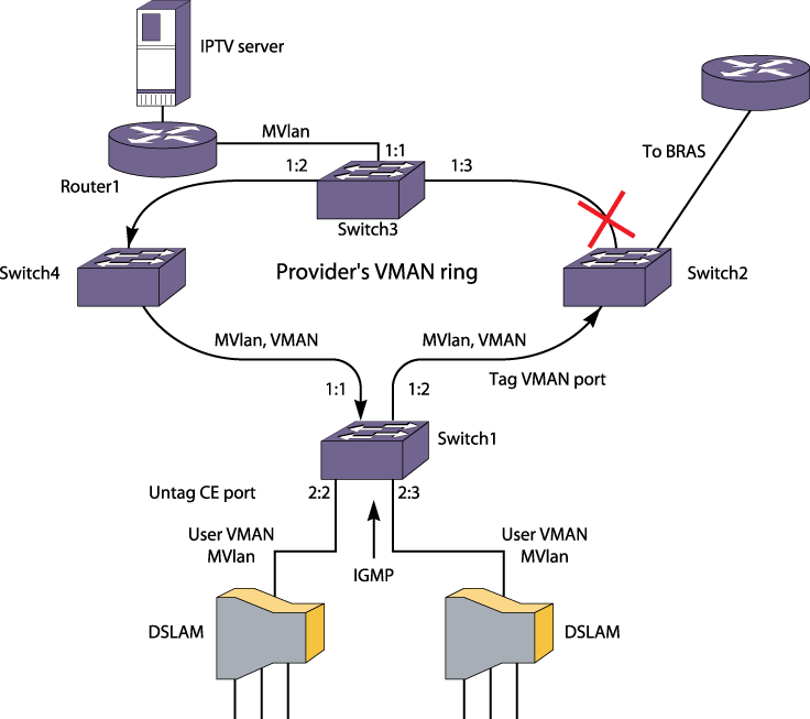 With MVR, switches on the VMAN do not have to run any routing protocol. If MVR is enabled on the multicast VLAN, MVlan, traffic is pulled from the IPTV server. Such multicast packets egressing from the CE port are always untagged. The downstream DSLAM distributes untagged multicast packets to the respective subscriber VLANs.