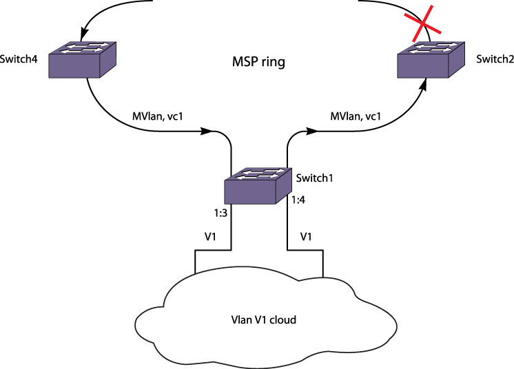 If the Layer 2 cloud is connected back to ring ports, traffic may end up leaking into VLAN V1 in the ring. There is no way to avoid that. So, such topologies must be avoided.The following is a typical configuration for Switch 1: