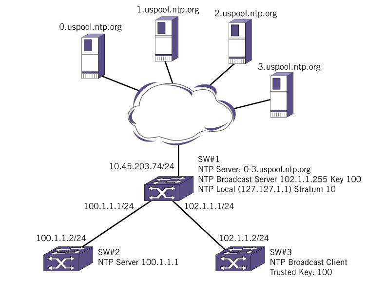 In the example shown in NTP Configuration Example, SW#1 synchronizes its clock from the 0-3.us.pool.ntp.org timer server, and provides the synchronized clock information to SW#2 as a unicast message, and to SW#3 as a broadcast message.