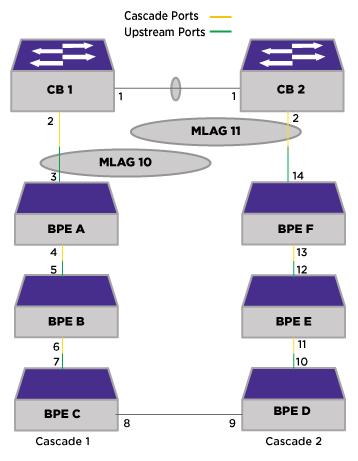 On CB-1, Cascade 2 is configured to use MLAG 11. On CB-2, Cascade 1 is configured to use MLAG 10. Such configurations are retained by the local CB even if the specified MLAG does not exist when the configuration is first processed.