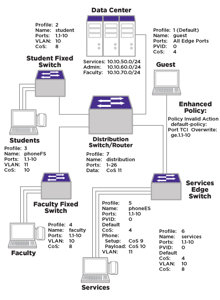 This section presents a college-based policy configuration example. College-Based Policy Configuration displays an overview of the policy configuration. This overview display is followed by a complete discussion of the configuration example.