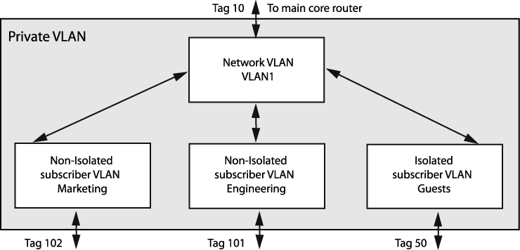 In Private VLAN Switch Components, the Engineering and Marketing VLANs are configured as non-isolated subscriber VLANs, which means that they act just like traditional VLANs, and they can participate in tag translation when VLAN translation is enabled on a network VLAN port that leads to network side location.