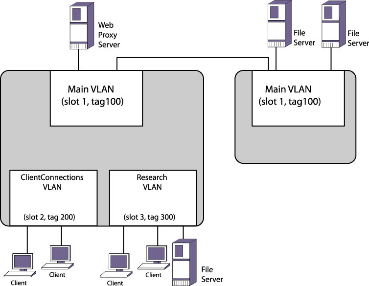 create vlan Main configure vlan Main add port 1:* configure vlan Main tag 100 create vlan ClientConnections configure vlan ClientConnections add port 2:* configure vlan ClientConnections tag 200 create vlan Research configure vlan Research add port 3:* configure vlan Research tag 300