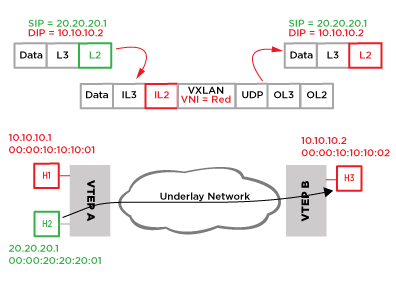 In Routing into a Tunnel, Layer 3 traffic is sourced from 20.20.20.1 and is destined for 10.10.10.2. The gateway for H2 to reach 10.10.10.2 is VTEP A. When traffic ingresses VTEP A, it is routed, and since the neighbor entry for 10.10.10.2 indicates that it is reachable through VTEP B, VTEP A encapsulates traffic with VNI “Red” and sends it over the tunnel to VTEP B. At VTEP B, traffic is decapsulated and is Layer 2 forwarded to H3.
