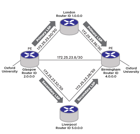 configure mpls rsvp-te path Glasgow-Birmingham-pri-path add ero 1.0.0.0/32 loose configure mpls rsvp-te path Glasgow-Birmingham-sec-path add ero 5.0.0.0/32 loose