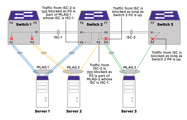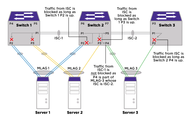 In the steady state when all the ports are enabled, the MLAG blocking rule prevents traffic coming from the ISC port to be forwarded to its