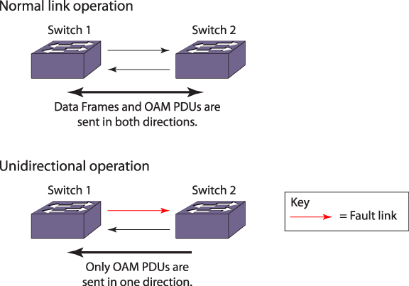 You can enable unidirectional link fault detection and notification on individual ports with CLI commands. This allows appropriate register settings to transmit OAM PDUs even on a link that has a slowly deteriorating quality receive path or no receive path at all. Then, when a link is not receiving a signal from its peer at the physical layer (for example, if the peer‘s laser is malfunctioning), the local entity can set a flag in an OAM PDU to let the peer know that its transmit path is inoperable.