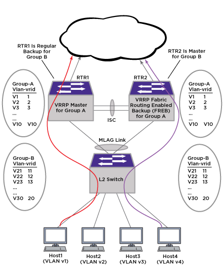 This is a typical topology for which this scaling is well suited. If the VLAN going down event triggers VRRP state change in one VLAN, a VRRP state change occurs on other VLANs also. This example has four hosts on different VLANs belonging to group A; traffic from hosts may get hashed to either of the MLAG links and reach either the VRRP master (RTR1) or the Fabric Routing-enabled backup router (RTR2). Both routers perform routing for host traffic. Group B has a different set of 10 VRRP VRs that were configured on a different set of VLANs and with a different set of VRIDs from that of Group A. Routers are configured for regular master-backup states (unlike Group A which has master-FREB states).