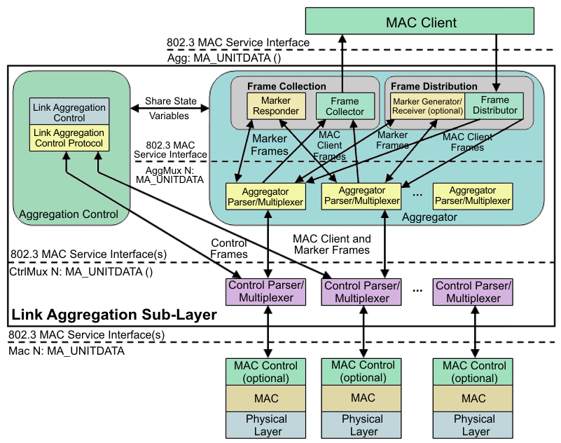 The IEEE 802.3ad standard comprises service interfaces, the LACP, the Marker Protocol, link aggregation selection logic, a parser or multiplexer, frame distribution, and frame collection functions.