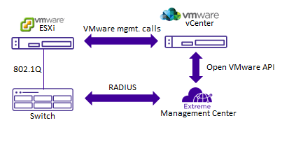 Endpoint Tracking integrates with ExtremeCloud IQ Site Engine ExtremeConnect and ExtremeControl modules. The ExtremeConnect module offers API integration with third party products, such as VMware or Mircrosoft HyperV, from which VM endpoint information is extracted and automatically converted into usable policies for use in the ExtremeControl module, which acts as a RADIUS server for authorizing Endpoint Tracking MACs.
