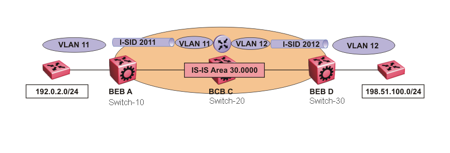 VRF CONFIGURATION ip vrf blue vrfid 100 VLAN CONFIGURATION vlan create 11 type port-mstprstp 1 vlan i-sid 11 2011 interface Vlan 11 vrf blue ip address 192.0.2.1 255.255.255.0 exit VLAN CONFIGURATION vlan create 12 type port-mstprstp 1 vlan i-sid 12 2012 interface Vlan 12 vrf blue ip address 198.51.100.1 255.255.255.0 exit