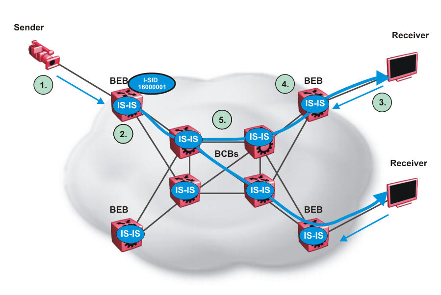 IS-IS acts dynamically using the TLV information it receives from BEBs that connect to the sender and the receivers to create a multicast tree between them. IS-IS creates very efficient multicast trees for the data I-SID allocated at the sender edge of the SPBM cloud to transport data between the sender and the receivers. The data I-SID uses Tx/Rx bits to signify whether the BEB uses the I-SID to transmit, receive, or both transmit and receive data on that I-SID. After IS-IS creates the multicast tree, the sender transports data to the receiver across the SPBM cloud using the data I-SID.