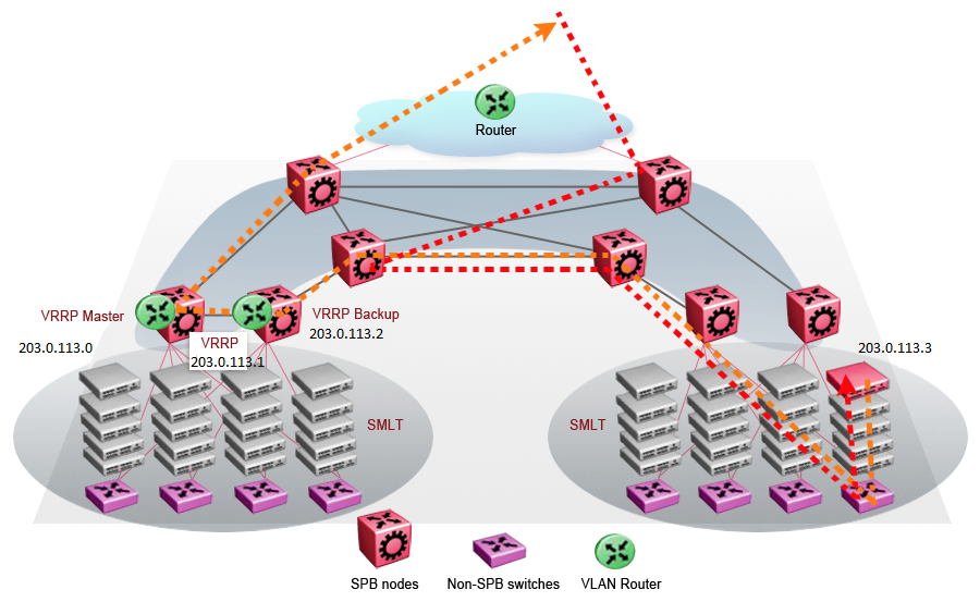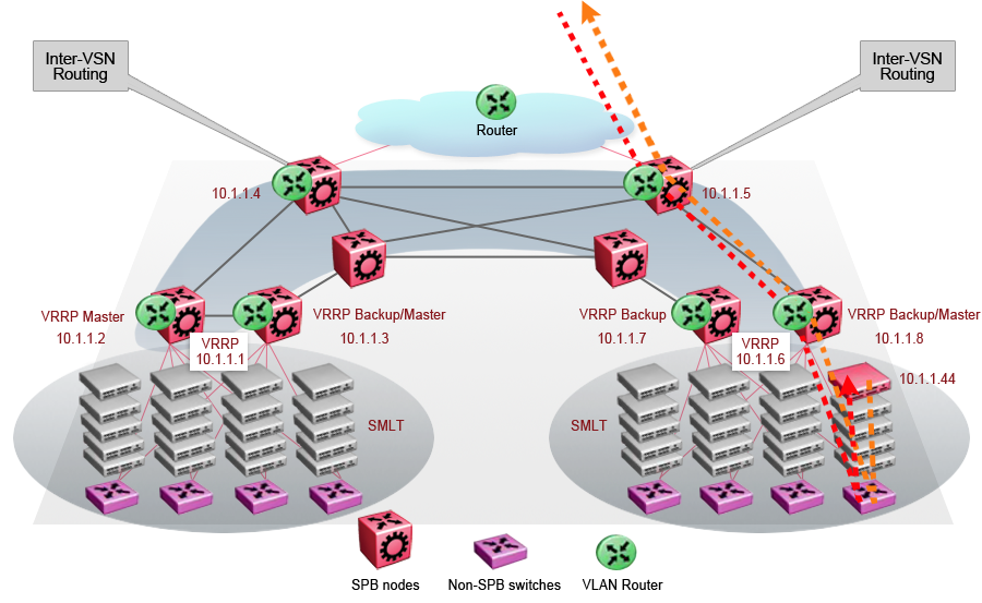 SPBM supports data centers with IP shortcuts, Layer 2 VSNs, or Layer 3 VSNs. If you use vMotion, you must use Layer 2 between data centers (Layer 2 VSN). With Layer 2 VSNs, you can add IP addresses to the VLAN on both data centers and run Virtual Router Redundancy Protocol (VRRP) between them to allow the ESX server to route to the rest of the network.