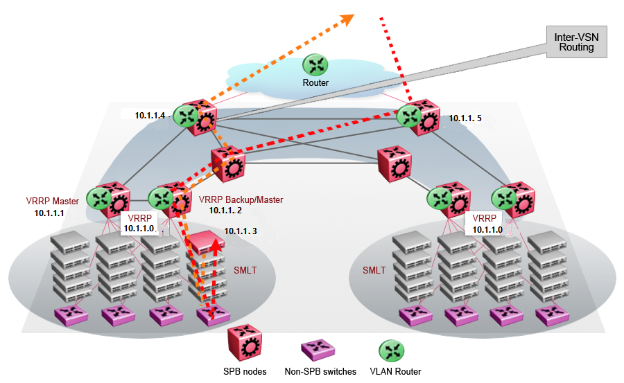 The following figure shows a solution that optimizes your network for bidirectional traffic flows. However, this solution turns two SPBM BCB nodes into BEBs where MAC and ARP learning will be enabled on the Inter-VSN routing interfaces. If you do not care about top-down traffic flows, you can omit the Inter-VSN routing interfaces on the SPBM BCB nodes. This makes the IP routed paths top-down less optimal, but the BCBs remain pure BCBs, thus simplifying core switch configurations.