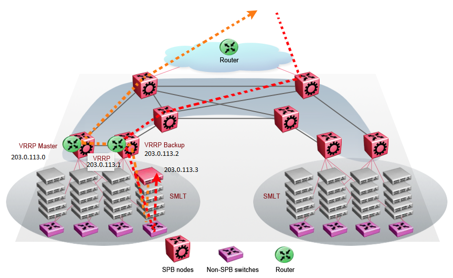 VRRP BackupMaster solves the problem of traffic congestion on the vIST. Because there can be only one VRRP Master, all other interfaces are in backup mode. In this case, all traffic is forwarded over the vIST link towards the primary VRRP switch. All traffic that arrives at the VRRP backup interface is forwarded, so there is not enough bandwidth on the vIST link to carry all the aggregated riser traffic. VRRP BackupMaster overcomes this issue by ensuring that the vIST trunk is not used in such a case for primary data forwarding. The VRRP BackupMaster acts as an IP router for packets destined for the logical VRRP IP address. All traffic is directly routed to the destined subnetwork and not through Layer 2 switches to the VRRP Master. This avoids potential limitation in the available vIST bandwidth.
