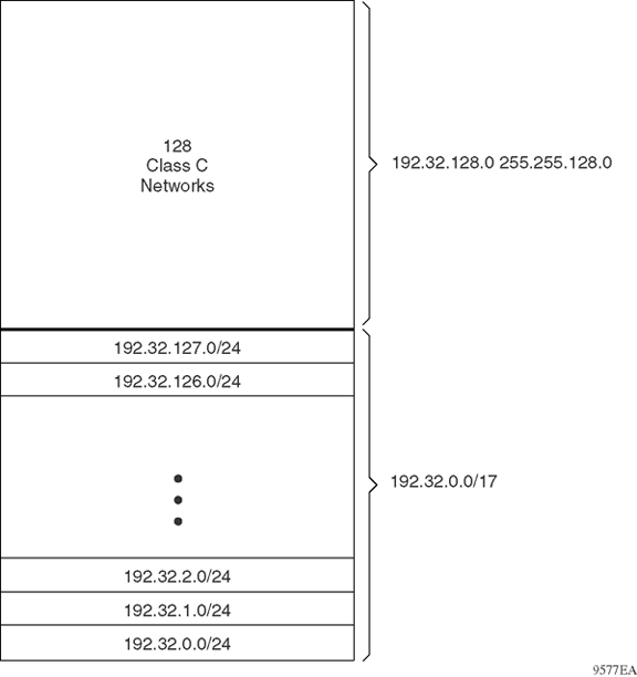Each supernet has a unique supernet address that consists of the upper bits shared by all of the addresses in the contiguous block. For example, consider the class C addresses shown in the following figure. By adding the mask 255.255.128.0 to IP address 192.32.128.0, you aggregate the addresses 192.32.128.0 through 192.32.255.255 and 128 class C addresses use a single routing advertisement. In the bottom half of the following figure, you use 192.32.0.0/17 to aggregate the 128 addresses (192.32.0.0/24 to 192.32.127.0/24).