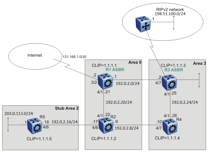 Network 203.0.113.0/24 on R5 uses a VLAN configuration instead of a brouter port. This example uses brouter ports rather than VLANs because the spanning tree algorithm is disabled by default if you use brouter interfaces.