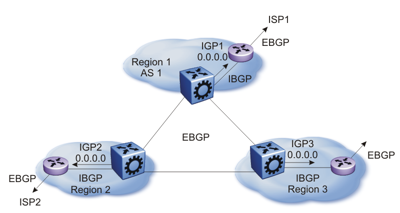 Regions logically interconnect by using a full-mesh iBGP, which also provides Internet connectivity.