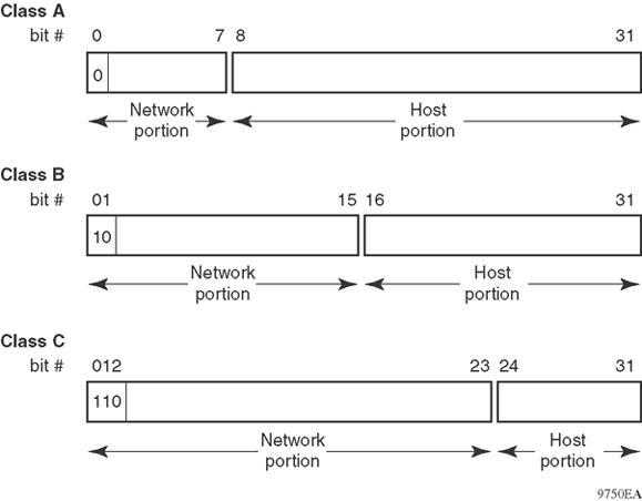 Each IP address class, when expressed in binary, has a different boundary point between the network and host portions of the address as illustrated in the following figure. The network portion is a network number field from 8 through 24 bits. The remaining 8 through 24 bits identify a specific host on the network.