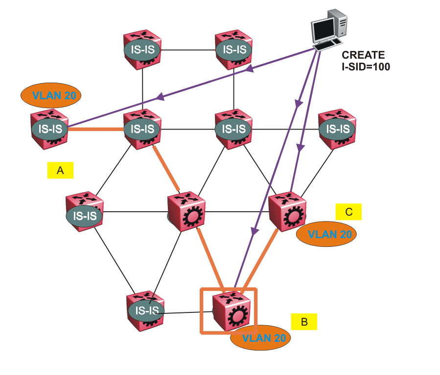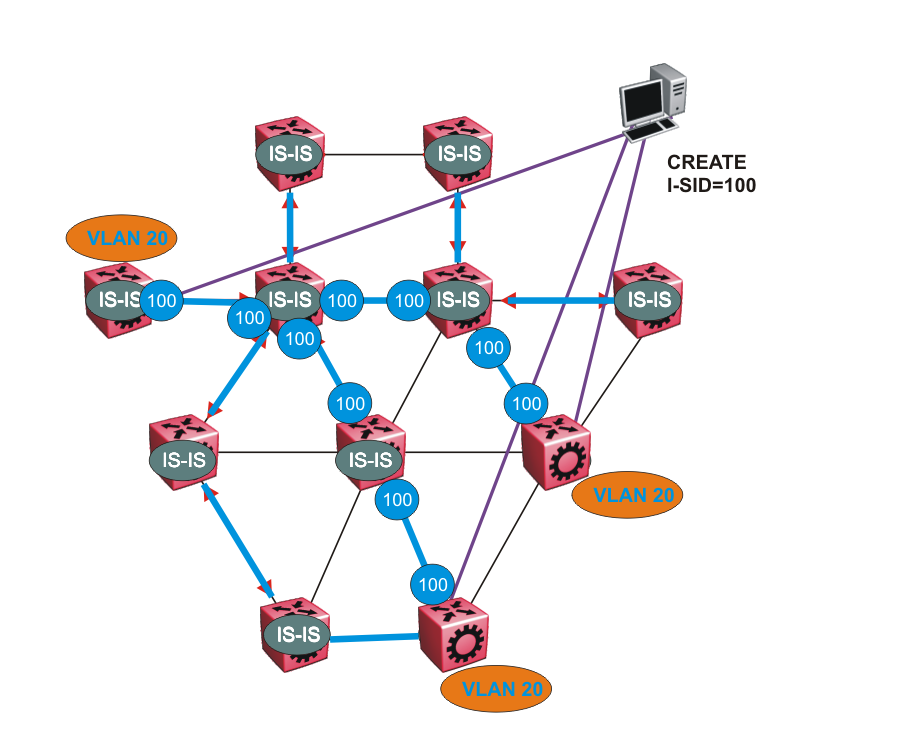 BMAC and I-SID information is flooded throughout the network to announce new I-SID memberships. In this case, VLAN 20 is mapped to I-SID 100.