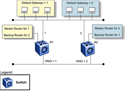 In the following figure, the first three hosts install a default route to the R1 (virtual router 1) IP address and the other three hosts install a default route to the R2 (virtual router 2) IP address. This configuration not only shares the load of the outgoing traffic, but it also provides full redundancy. If either router fails, the other router assumes responsibility for both addresses.