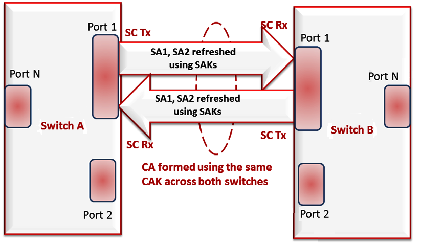 A connectivity association (CA) is a logical representation of a MACsec domain within a network. Each connectivity association is associated with a connectivity association key (CAK). MACsec links are associated with a CA to establish end-to-end MACsec communication. Every MACsec enabled interface is a member of one connectivity association. Switch ports are members of a connectivity association, and can only be a member of one connectivity association.