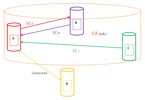 In the following figure, CA connects switches A, B, and C by their respective SC and SAK. Switch D cannot participate in the secure communication between A, B, or C as switch D is not configured with the SAK.