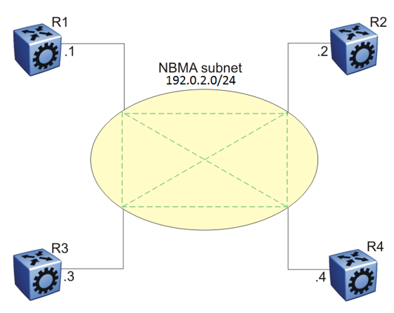 The following figure shows an example of four routers attached to an NBMA subnet. The NBMA segment uses a single IP subnet and each router uses an IP address within the subnet.