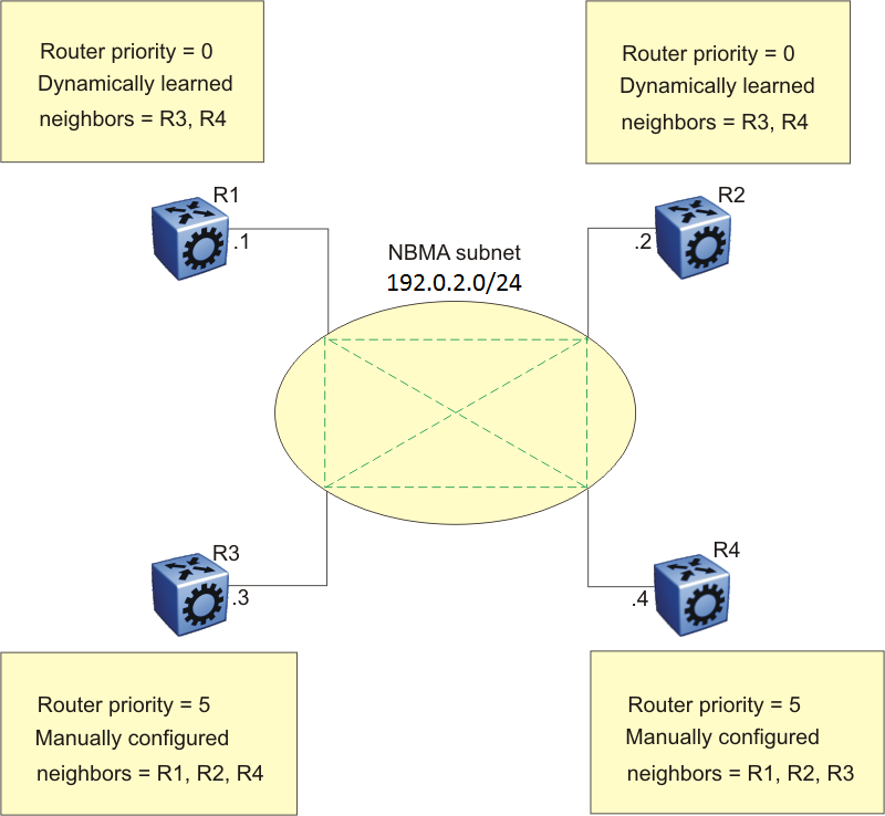 The following figure shows an NBMA subnet with router priorities and manually configured neighbors.