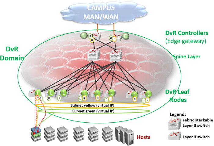 An important benefit of DvR is that only minimal configuration is required on the Leaf node. Based on the Layer 2 VSN that the Leaf node is a part of, all Layer 3 configuration information (IPv4 Unicast and Multicast configuration) is pushed from the Controllers in the domain. Thus the leaf nodes, although basically Layer 2 configured switches, become fully layer 3 capable devices.