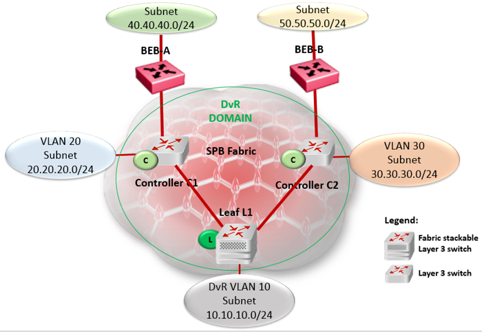 By default, if the injection of default routes is enabled on a DvR Controller, the DvR Leaf node can only route traffic to other nodes within the DvR enabled subnet. For the Leaf node to reach networks outside of the DvR enabled subnet, the Controllers must redistribute local and static routes from non-DvR subnets into the DvR domain. In the following figure, the DvR Leaf L1 can route traffic only to nodes in the DvR enabled subnet 10.10.10.0/24. To be able to reach hosts in VLAN 20 (20.20.20.0/24) or VLAN 30 (30.30.30.0/24), redistribution of local routes into DvR is required at each of the Controllers C1 and C2. For the Leaf node to reach hosts in remote networks 40.40.40.0/24 or 50.50.50.0/24, redistribution of static routes to the DvR domain is required.