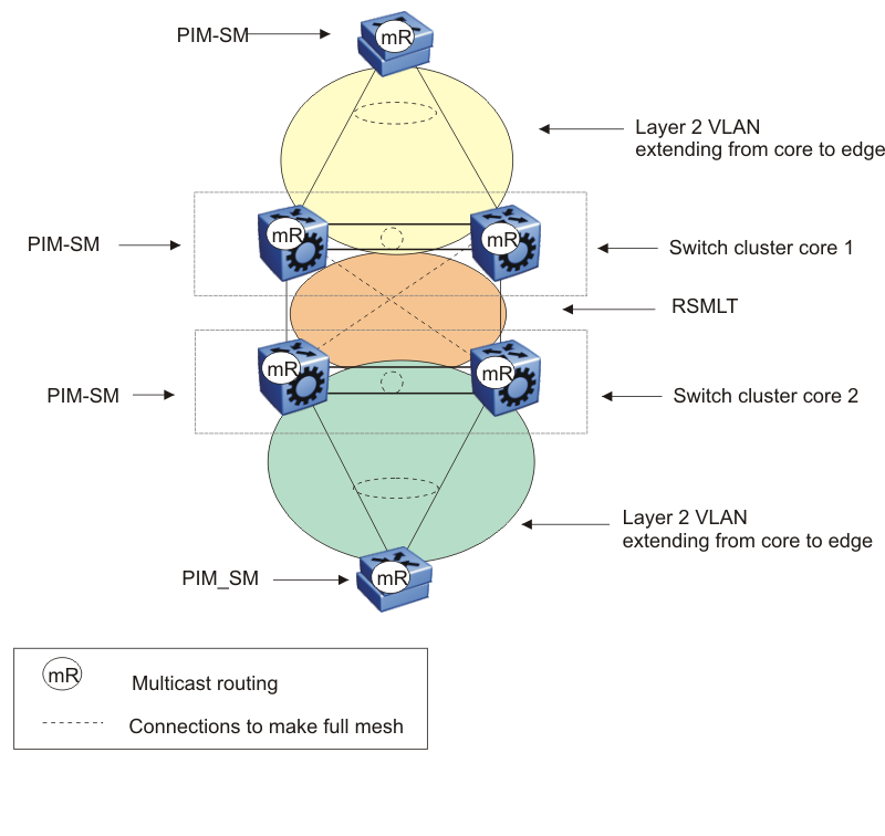 In the preceding figure, both of the switch cluster cores and the edge devices perform Layer 3 multicast routing.