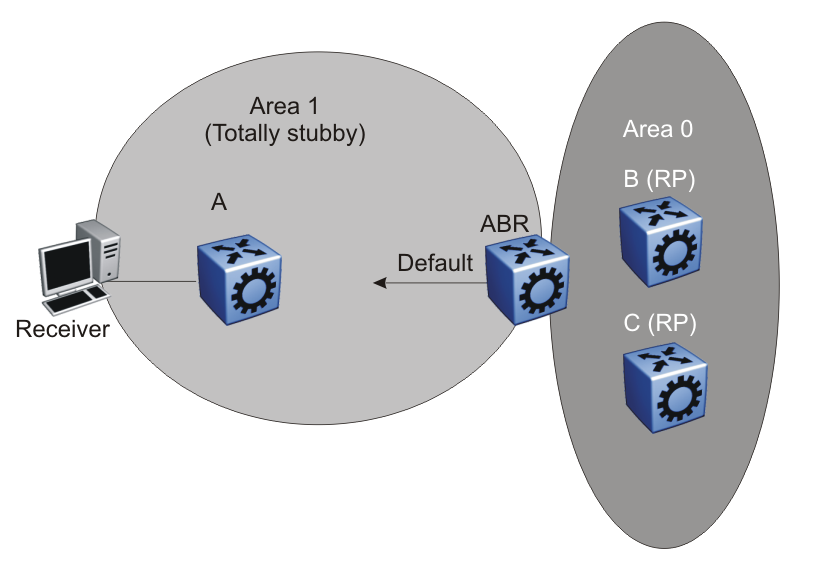 The following figure shows a hierarchical OSPF network where a receiver is in a totally stubby area. If RP B fails, PIM-SM router A does not switch over to RP C because the injected default route in the unicast routing table indicates that RP B is still reachable.