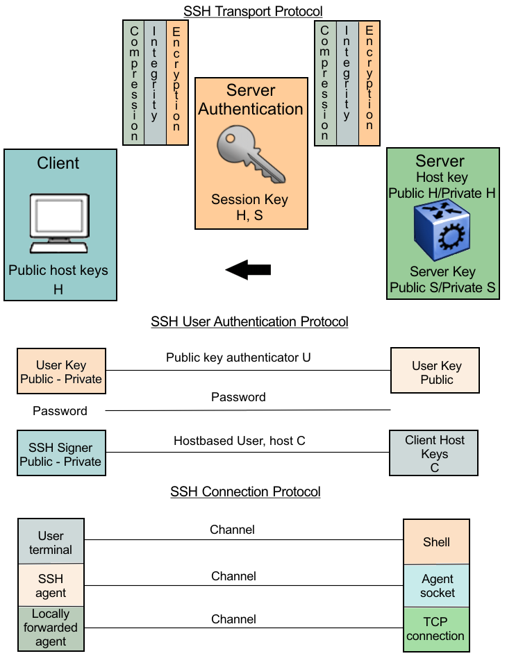 SSH version 2 (SSHv2) protocol is a complete rewrite of the SSHv1 protocol. In SSHv2 the functions are divided among three layers: