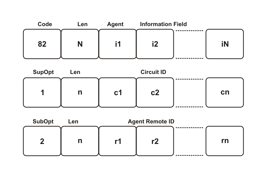 The Relay Agent Information option (code 82) is a container for specific agent-supplied suboptions; Agent Circuit ID (code 1) and Agent Remote ID (code 2). The suboptions can represent different information relevant for the relay. The fields are encoded in the following manner, where N or n is the total number of octets in the Agent Information Field (all bytes of the suboptions):