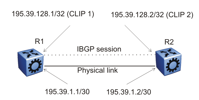 For example, as shown in the following figure, a physical point-to-point link exists between R1 and R2 along with the associated addresses (195.39.1.1/30 and 195.39.1.2/30). Use an interior Border Gateway Protocol (iBGP) session between two additional addresses, 195.39.128.1/30 (CLIP 1) and 195.39.281.2/30 (CLIP 2).