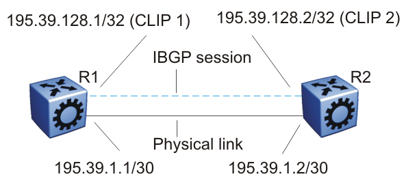 Circuitless IP (CLIP) is a virtual (or loopback) interface that you do not associate with a physical port. You can use a CLIP interface to provide uninterrupted connectivity to your switch as long as an actual path exists to reach the device. For example, as shown in the following figure, a physical point-to-point link exists between R1 and R2 along with the associated addresses (195.39.1.1/30 and 195.39.1.2/30). Note also that an iBGP session exists between two additional addresses 195.39.128.1/32 (CLIP 1) and 195.39.128.2/32 (CLIP 2).