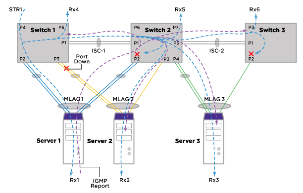 Traffic Flow with Local MLAG Port Down figure depicts a traffic flow scenario when the local MLAG port is down. When the local MLAG port is down, IGMP group information received from the peer MLAG router will result in ISC being added as egress port. Now traffic stream STR1 ingressing Switch 1 will go over ISC-1 to Switch 2 where it gets forwarded towards Server 2 over P3.