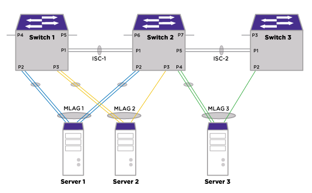A port is an MLAG port only with respect to a particular MLAG peer switch. In the above example, the “green” port on switch-2 is an MLAG port with respect to switch-3 on ISC-2. It is not an MLAG port with respect to switch-1 on ISC-1. Similarly, on switch-2, “blue” and “orange” ports are MLAG ports with respect to switch-1 on ISC-1. They are not MLAG ports with respect to switch-3 on ISC-2.