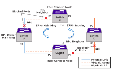 ERPS Virtual channel is enabled in the above configuration by creating a control vlan of the sub-ring [c_vlan_sub] and added as a protected vlan in switch A, B and C‘s main ring.