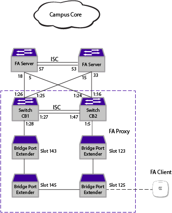 This configuration example shows how to configure Fabric Attach (FA) proxy controlling bridge (CB) Extended Edge Switching This command is available on all Universal switches supported in this document. Ring CB peers to receive and approve VLAN/NSI mappings from FA clients connected to BPEs.